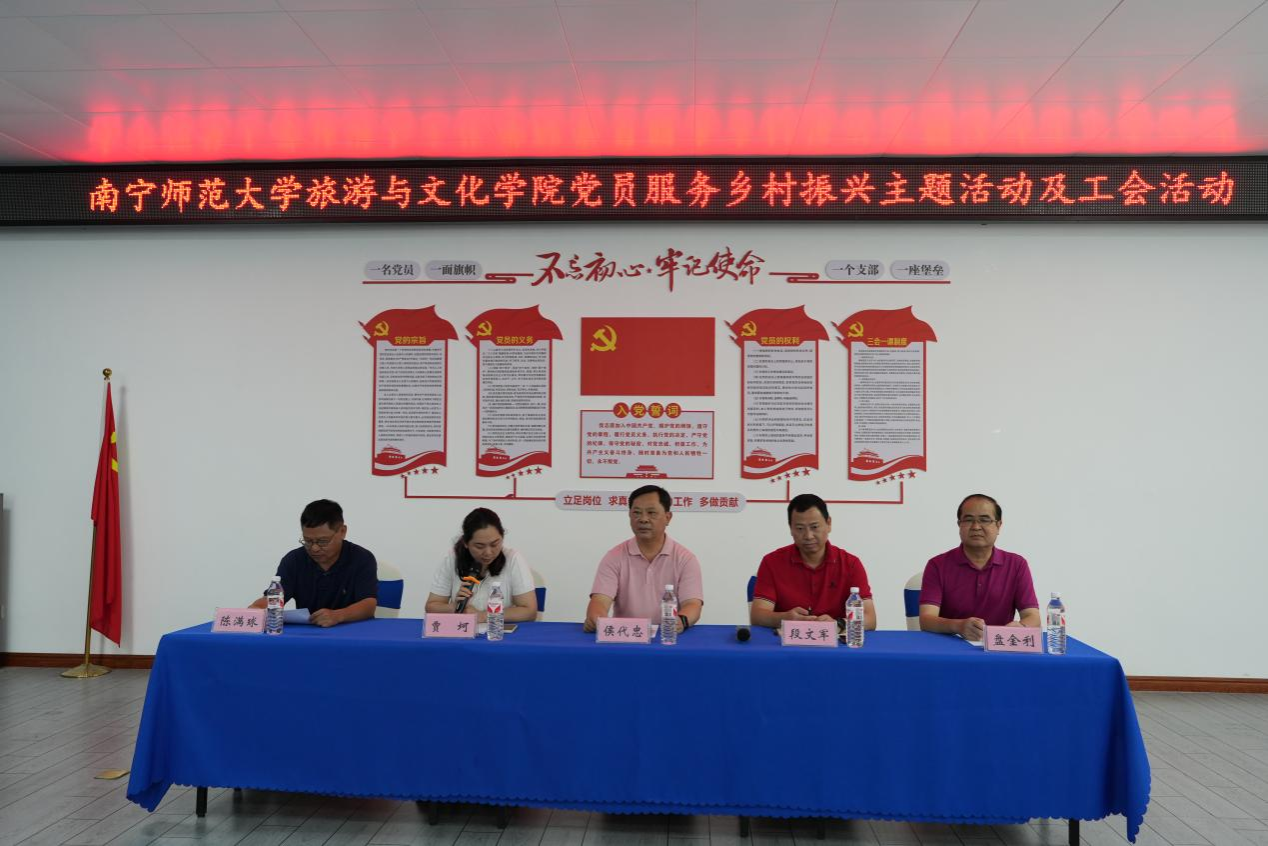 为发挥国家样板党支部“服务有力”的党建引领作用,凝聚育人合力,服务地方发展,10月19日,公司党委副书记侯代忠带领太阳成集团tyc33455cc班子及全体教师到广西四季那廊生态园开展国家样板党支部服务乡村振兴活动,并就实践教学基地共建合作展开讨论,举行实习实训基地揭牌仪式。太阳成集团tyc33455cc党委副书记侯代忠,广西中小学研学旅行学会秘书长盘金利,四季那廊生态园董事长陈满球,旅游与文化公司党委副书记、经理段文军及太阳成集团tyc33455cc教师代表参加了研讨,会议由旅游与文化公司党委书记贾坷主持。
