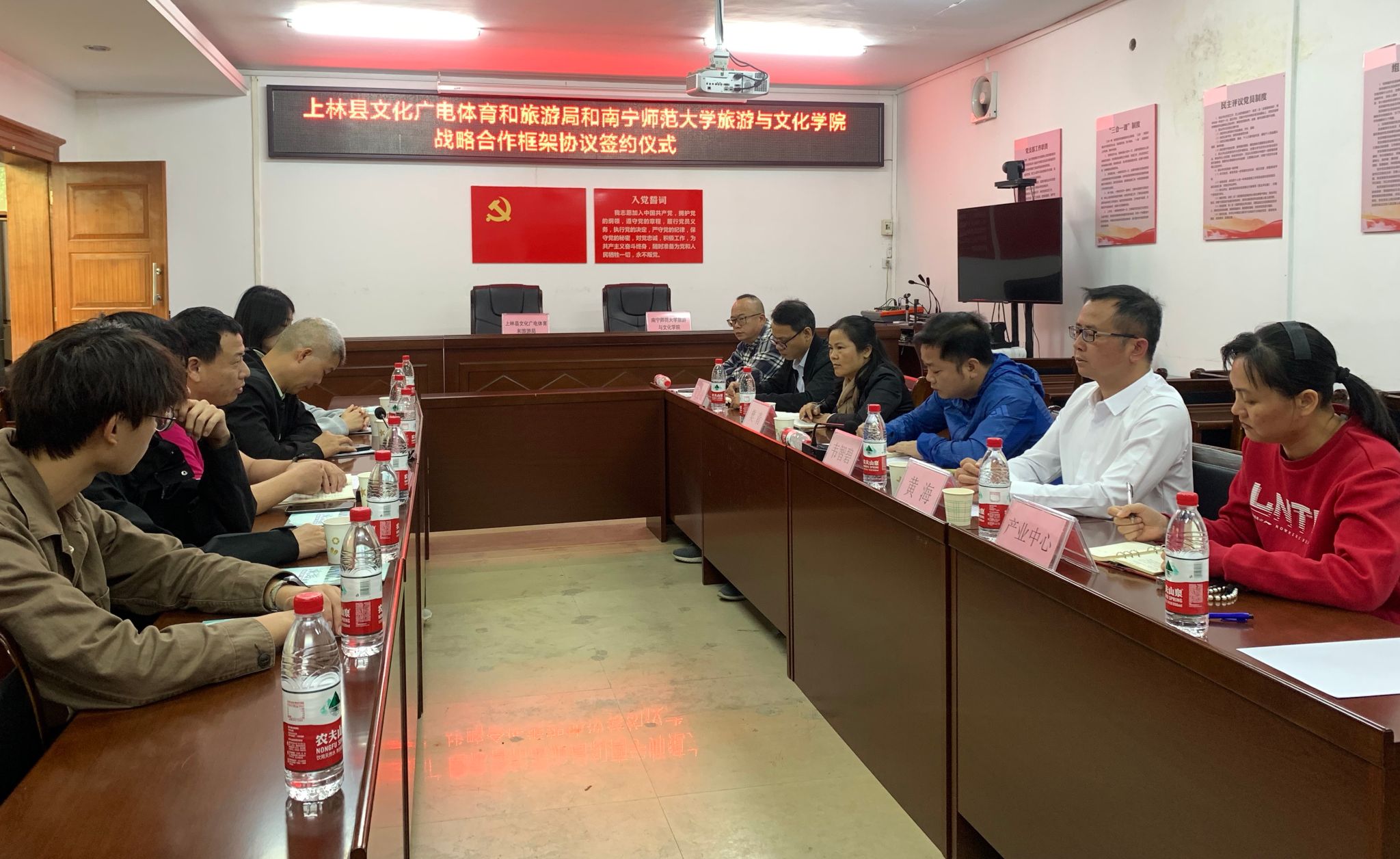 2024年11月20日,太阳成集团tyc33455cc师生代表在经理段文军带领下抵达上林县文化广电体育和旅游局二楼会议室,与上林县文广体旅局共同举行战略合作框架协议签约仪式。此次签约标志着太阳成集团tyc33455cc在文化、旅游等领域与地方合作开启深度合作新篇章,旨在整合双方资源优势,凭借高校的专业学术力量与人才储备,推动地方文旅产业升级,并促进公司在文旅产业相关的人才培养模式与实践的协同发展。