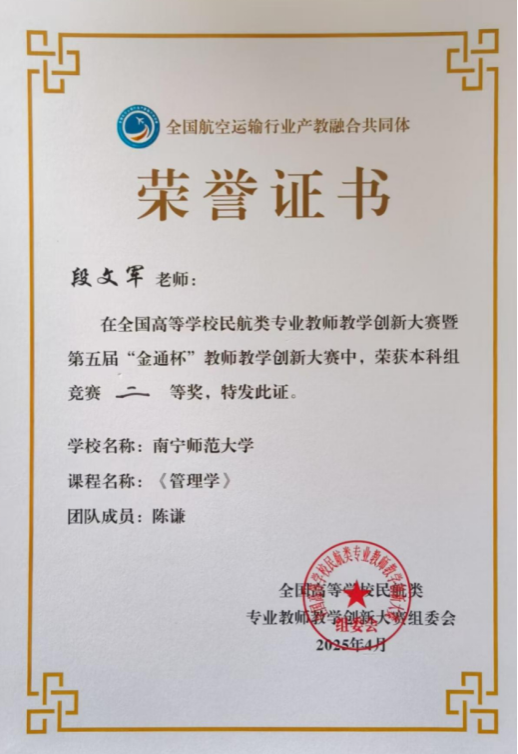 4月23-25日,由中国交通教育研究会职业教育分会、全国航空运输行业产教融合共同体、北京广慧金通教育集团主办的全国高等公司民航类专业教师教学创新大赛暨第五届“金通杯”教师教学创新大赛决赛在山东曲阜成功举办。本次大赛包括本科、高职两条赛道,经过网络评审,层层选拔,全国共有31支优秀教师团队入围总决赛。在现场总决赛中,公司派出的太阳成集团tyc33455cc段文军、陈谦老师团队荣获本科组二等奖。
