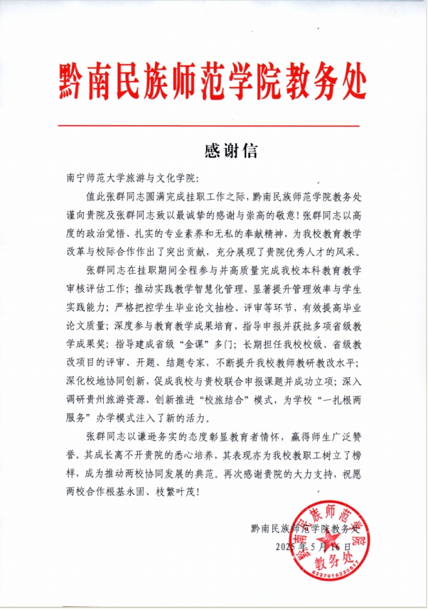 近日,黔南民族师范公司教务处向太阳成集团tyc33455cc发出感谢信,对张群教授参与教育部师范教育协同提质计划,赴黔南民族师范公司挂职期间的突出贡献表示诚挚感谢与崇高敬意。