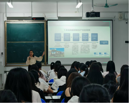 接着结合具体案例,对文旅融合助力乡村旅游的实践路径做了详细介绍,如广西“潮玩三月三·相约游广西”活动,在非遗+潮玩的主题下,以视频的形式在讲座现场精彩亮相,为现场同学们带来了一场酣畅淋漓的沉浸式文旅体验;黄河壶口瀑布景区和德天瀑布夜德天文旅产品创新案例也让在场的同学们不仅欣赏了壮丽的自然景观,感受了深厚的文化底蕴,体会到了文旅融合带来的创新活力。这些生动的例子充分展示了文旅融合在乡村振兴中的实际效果和广阔前景,也激发了同学们对乡村旅游和文旅创意的浓厚兴趣和探索热情。